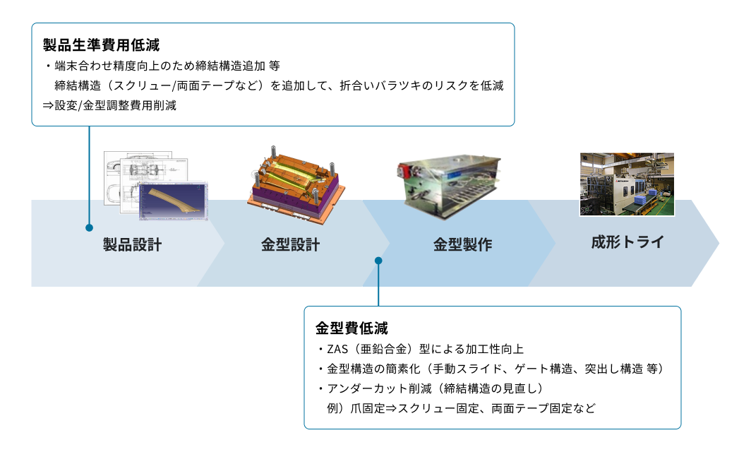また、金型製作が前倒しできることにより、設計~金型製作リードタイムを短縮でき、お客様の生産準備期間を十分にとることができるため、製品完成度の向上が期待できます。