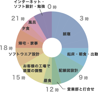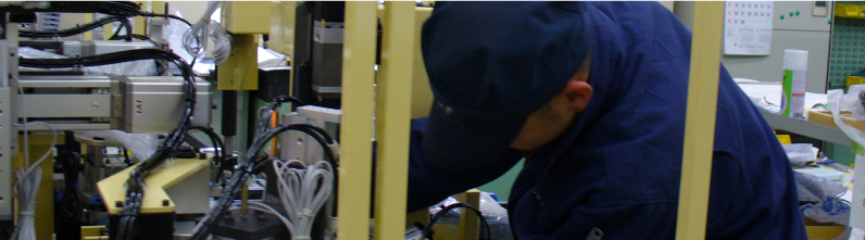 電気に関わる一連の業務に関わっています。具体的には、機械設計から上がってきた図面をもとに装置をどうやって動かすか配線図を設計したり、ハードウエアを動かすためのソフトウエア設計・設置も行います。また、お客様の工場での装置の立ち上げや調整なども私たちの仕事。自分の仕事に責任を持ち、お客様に満足してもらえるように、とプロ意識を持って業務にあたっています。