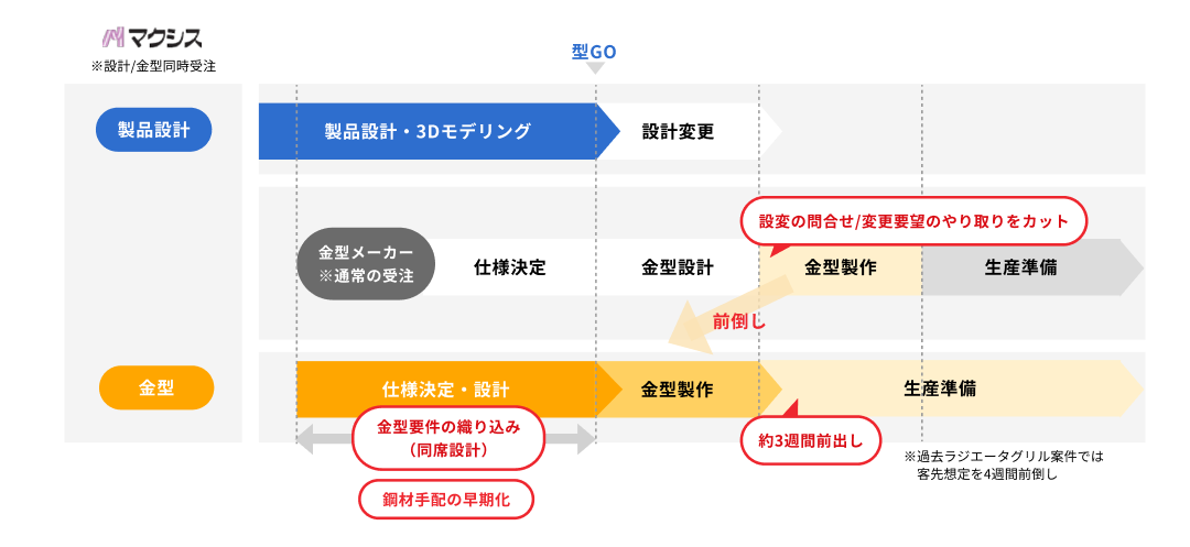 また、金型製作が前倒しできることにより、設計~金型製作リードタイムを短縮でき、お客様の生産準備期間を十分にとることができるため、製品完成度の向上が期待できます。
