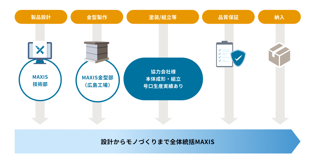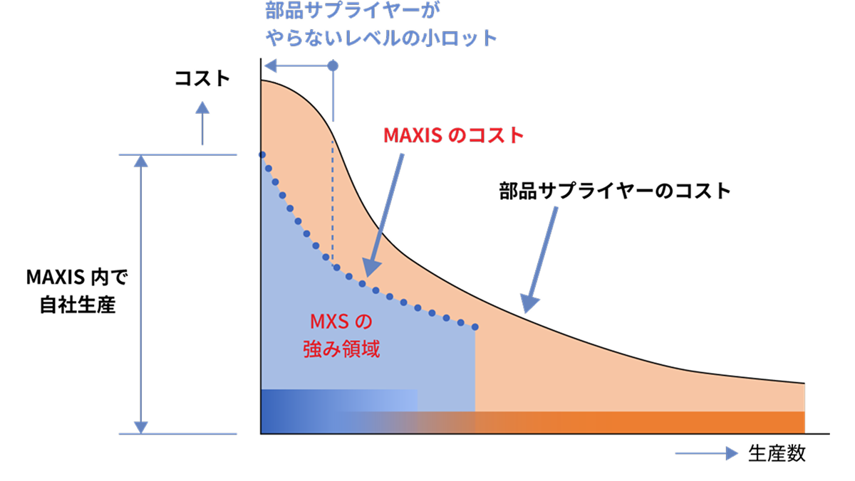 マクシスエンジニアリングは自社の機械設計者、金型技術者、協力企業さまと連携し小ロットならではの条件を製品・金型構造に織り込み、トータルコストを低減いたします。